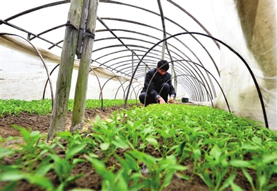 16日,通城县五里镇蔬菜基地,菜农朱耀强正在抚育辣椒苗,为明春的移栽作准备。