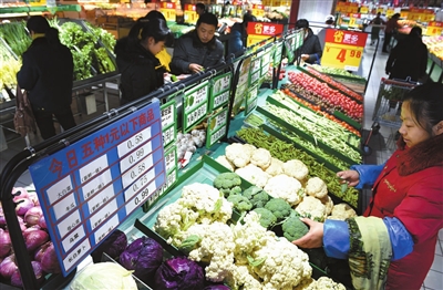 12月25日,在合肥市瑶海区铜陵路街道辖区的一家大型超市内,消费者在选购蔬菜。当日,安徽省合肥市2015年度元旦、春节“惠民菜篮子”活动正式启动。活动期间,消费者可在全市22家超市、159个门店买到便宜的蔬菜。据新华社