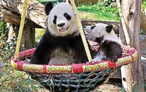 饲养员透露,他们极少看见熊猫母子同用一个吊床的可爱场面。
