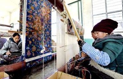 昨日,工人在江孜县地毯厂手工编织房内编织卡垫。“卡垫”是藏语小型藏毯的意思。江孜是西藏著名的卡垫之乡。2011年,江孜县地毯厂被授予“国家级非物质文化遗产生产性保护示范基地”。据新华社