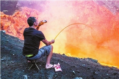 瓦努阿图安布里姆岛火山,来自新西兰的冒险家SimonTurner为了能将此行变得更有意义,带着啤酒和棉花糖一同前往,“不要命”地坐在火山口旁,用帐篷桩勾着棉花糖,连着帐篷杆在火山口烤棉花糖吃。这里的岩浆温度高达2000多华氏度(约1093℃)。