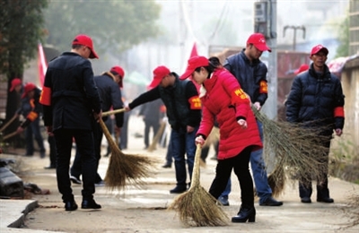 7日,咸安区肖桥村的志愿者们义务在村头巷角打扫卫生。这支志愿者队伍由当地60位村民自发组成,其中年龄最大的志愿者73岁,他们利用自己的空余时间为村湾打扫卫生,帮助年老村民做家务,带着村里的留守儿童做游戏,深受村民的赞扬。 通讯员 吴涛石莉摄