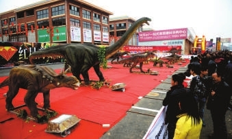 5日,记者在嘉鱼县亿中红星商贸城看到,侏罗纪时期的各类仿真恐龙吸引了不少当地市民观看。