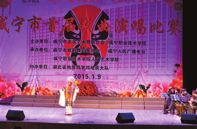 9日晚,在咸宁职院科学会堂,我市首届戏曲演唱比赛正在举行。