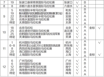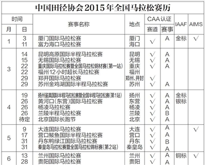 目前公布的2015年马拉松赛历中,达到国际田联金标的有4站,银标和铜标各1站,中国田协A级赛事30站。