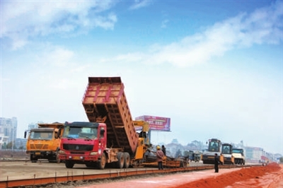 2014年12月26日,迎宾大道施工现场,工人们正在铺设路基。据悉,该项目全长5.04公里,总预算39820万元。目前,正在进行路基及桥梁施工,并已完成500米路面试验段铺筑工作。 通讯员 李浩摄