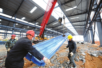12日,赤壁光谷工业区华舟重工应急装备1号车间内,工人们正在安装屋顶材料。