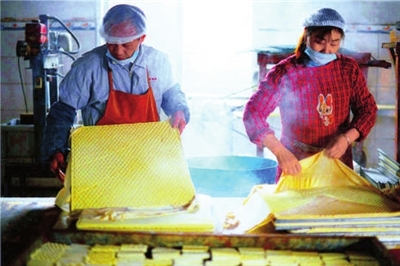 昨日,通城县“易师傅”豆制品专业合作社社员在生产豆腐干。关刀镇里港村易建曲在豆制品行业摸爬滚打20多年,办起了豆制品加工厂,吸纳周边50多人就近就业,年加工转化黄豆50吨,带动麦市、关刀、塘湖等5个乡镇近万户农户种植黄豆共同致富。 通讯员 麦先摄
