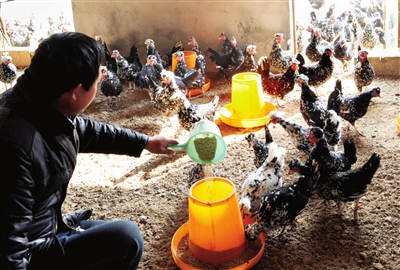 19日,崇阳县天城镇景博园内中工肖仁敏正在给贵妃鸡喂食。去年该园利用良好自然环境,从福建引进种鸡在山间饲养,通过种鸡蛋进行人工孵化养殖,如今已形成规模,年出栏上千只。 记者 大乐 特约记者 汪淑琴摄
