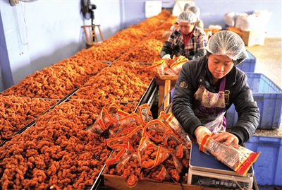 26日,崇阳县维德食品有限公司包装车间,工人正在将酥香可口的麻花称重装袋。该公司主要生产特色大麻花、香米酥等10余个品种,日产麻花30吨,在全国建有42个销售网点。成为消费者走亲访友的馈赠佳品。记者 陈红菊 通讯员 王芳芳 刘旺云摄