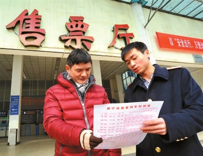 火车站工作人员披挂着“咸宁欢迎你”的绶带,向归乡的旅客发放春运列车时刻表;铁路派出所民警们一直守在现场维持秩序……春运首日,这里忙碌而有序。