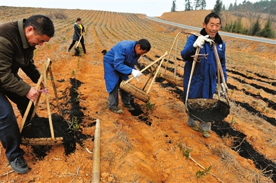 2日,崇阳青山镇城万村茶叶基地上,村民在给茶叶施用有机肥。