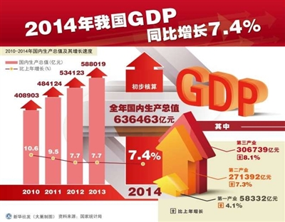 据新华社北京2月26日电 中国经济运行态势如何?国家统计局26日发布的《2014年国民经济和社会发展统计公报》,以一连串数据勾勒出我国经济增长平稳、结构优化、质量提升、民生改善的运行全景,全年国内生产总值达到636463亿元,增长7.4%;就业不减反增,全年城镇新增就业1322万人,农民工总量同比增长1.9%;物价较为稳定,粮食生产喜获“十一”连增……