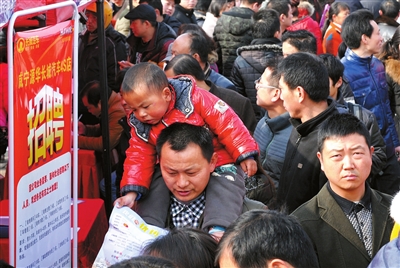 8点半,父子俩站在招聘会现场——市人民广场,这里已经挤满了像他们一样的数千名应聘者。
