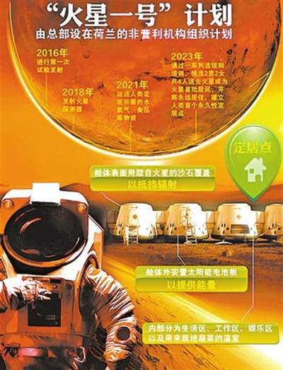据外媒近日报道,在当今世界上诸多由民间自发推出的太空旅游或宇航探索项目中,最引人注目的恐怕要数最近完成全球选拔准备单程前往火星成为第一批当地永久居民的“火星一号”计划。“火星一号”在全球数以万计报名志愿者中已选出包括2名华裔和5名英国人在内的首批百名殖民者,并坚持称将在2025年之前实现火星登陆。