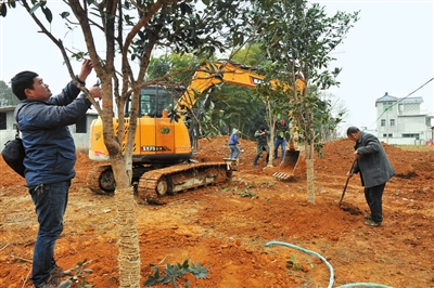 2月底,崇阳青山镇磨刀村村民在栽种桂花树。1月初开始,该村在村组公路两侧、主要河堤(渠)和居民区种树,共植树3000多棵。