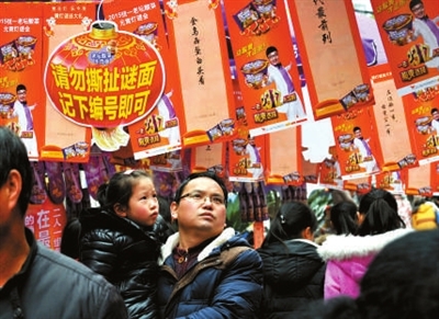5日,温泉路中百仓储广场前,一对父女正在猜灯谜。当天是元宵佳节,市民纷纷走出家门,感受节日氛围,百余个涉及文学、日常生活、人名、地名的灯谜吸引了过往市民驻足猜想。 记者 夏正锋摄
