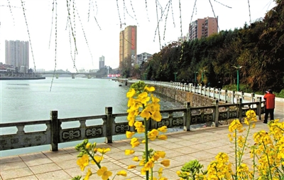 昨日,市民在赤壁市“一河两岸”滨水景观带观赏游玩。 近年来,赤壁市不断加快山水城市建设,加大城市建设力度,让人民群众共享“生态红利”、分享“绿色福利”,打造天蓝、地绿、水净的美好家园。 通讯员 姚东旭摄
