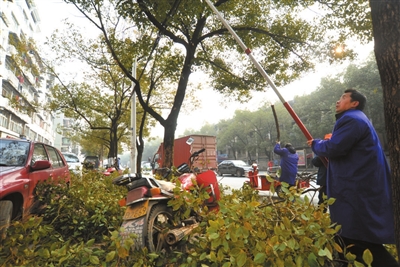 4日,咸安区园林局工作人员走上街头,对道路两旁的树木进行整枝。