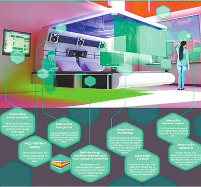 在卧室娱乐方面,未来的卧室将把屏幕置于床上方,让人们看着星辰进入梦乡。此外,相关系统还会在人们熟睡时监视其健康状况。在孩子的卧室,父母的交互式全息图可以始终陪伴在他们身边,给他们讲睡前故事。卧室的智能窗户能够定制美景,让人们每天早上醒来时都能观赏到自己希望的景象。
