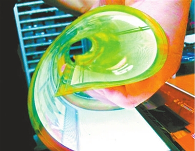 LG公司发布了18英寸(约合46厘米)曲面电视Ultra HD TV,背托采用一种特殊的膜,而不是塑料,允许屏幕弯曲。这款电视采用柔软可弯曲的OLED(有机发光显示器)屏幕,分辨度可达到1200×810,像素达到100万兆,最大卷曲半径可达到3厘米,同时不会影响显示效果。(本报综合)