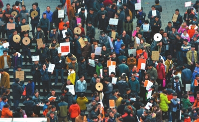 3月9日,在义乌市人力资源市场,手举招聘信息的人们在等待应聘者。
