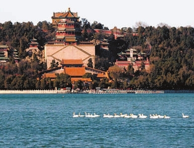 昨日,北京天气晴好,30余只白天鹅飞落颐和园昆明湖并在蓝天上展翅翱翔。 (据新华社)