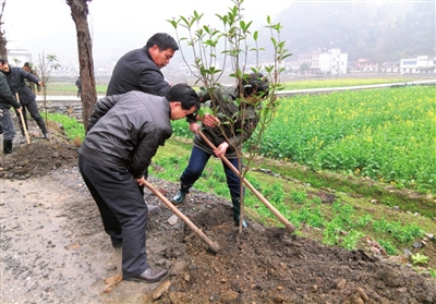 眼下正值植树高峰,乡政府调配给该村银杏树苗600株、红豆杉树苗500株、桂花树苗500株、栾木苗200株,村民自发购买杉树 2000余株 ,大伙纷纷抢抓时机,在公路两侧、房前屋后植树造林,美化家园。