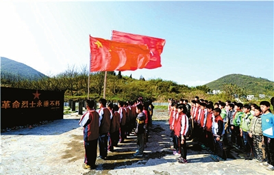 4月2日,塘湖镇大埚村小学生为当地革命先烈扫墓。