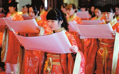 当日,西安多名汉服爱好者齐聚汉城湖举行汉式女子成人礼。仪式上30余名少女依照古时习俗,挽发髻、插发簪、祭轩辕,以这种方式开启人生新旅程。
