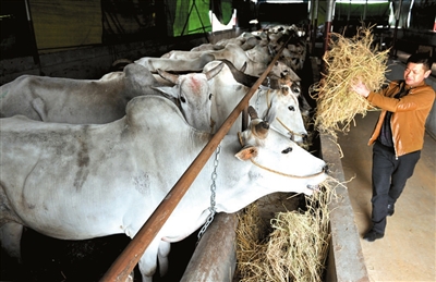 7日,崇阳县石城镇汉兴牧业基地,骠肥体壮的缅甸驼峰牛静静地吃着干草。