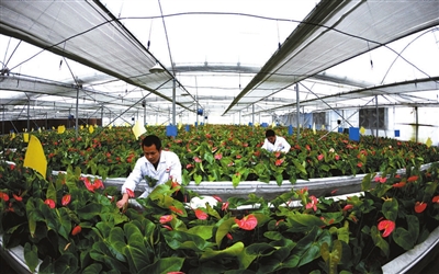 10日,湖北坤元第五季现代农业温棚基地内,工人们正在培育红掌花卉。