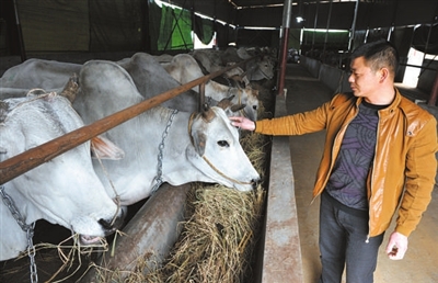 8日,崇阳县石城镇汉兴村汉兴牧业基地,骠肥体壮的缅甸驼峰牛正低头吃着干草。该基于去年3月份开始创建,由3个具备养牛经验和销售渠道的回乡创业青年合伙创办,预计今年出栏400头牛左右。