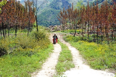 “这条路是我们自己修的,花了20多万。石头山留不住水,一下雨,水就从山上往下泄,形成水打沟,最深的有三四十厘米。这样的石头山,种树确实有点难。”庞余良边骑车边跟记者讲起他修路、种树的故事。