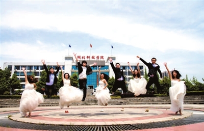4月28日,湖北科技学院,11级电信实验班的29名学生,穿着婚纱、西装,摆出各种创意造型,拍照留影,成为一道充满青春活力的风景,吸