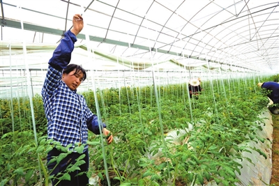 4月29日,嘉鱼县新街镇王家月村长行果蔬专业合作社基地,菜农们正在给黑番茄搭架。