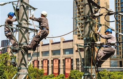 5月3日,咸宁供电公司员工在市区林立的高楼缝隙中劳作。为如期完成投资1.3亿元的城区配电电网智能化改造工程,提高城市的持续供电能力,咸宁供电公司110余名员工节日期间坚守岗位,在都市楼群中穿梭织网。通讯员 邓东峰摄