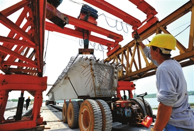 5月3日,武汉城市圈环线高速公路咸宁西段下澥4号桥,工人正在吊装桥面箱梁。