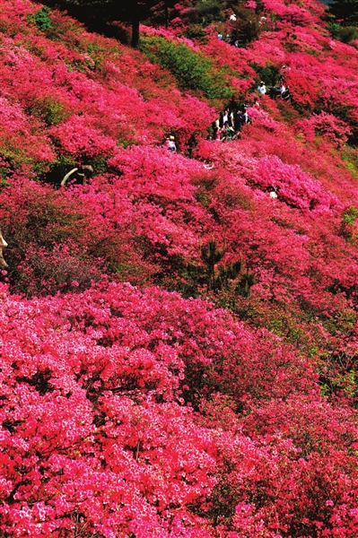 沿着实木栈道边走边聊,不知不觉,进入杜鹃花丛。尽管上山前曾遐想无穷,但仍被强烈震撼着:这是一片从未见过的耀眼和艳丽的红色海洋,远看是大红,近看是嫣红,漫山地泻下来。触目所及,花浪翻滚,花云漫卷,花瀑奔流,真个是织锦堆绣,万千绚烂。