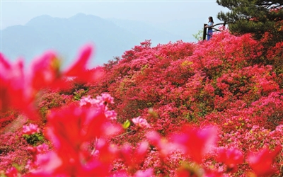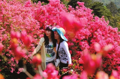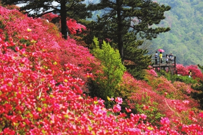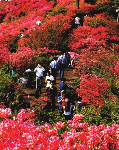 这里的杜鹃情牵人间,不仅是热情奔放之花,更是幸福和谐之花。她装点江山,把馨香带给千家万户;她红的像火,黄的似金,给人们带来美好、幸福的憧憬。龟峰山脚下,成千上万农民洗脚上岸,开旅馆,做餐饮,搞服务,红红火火建起民俗一条街,仅“农家乐”就有300多家。近3年,麻城接待游客500万人次,旅游综合收入30余亿元。杜鹃花宛若“摇钱树”,带活了麻城旅游,带红了麻城经济。