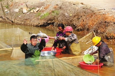 5月4日,渡普镇王家庄村大屋洲村民周红卫正在将自家鱼塘内的鱼苗进行分检,准备销往外地。渡普镇水域面积广阔,可用养殖水面8万亩,年水产品总量达5万吨,该镇一半以上农户每年80%的经济收入来自水产业。