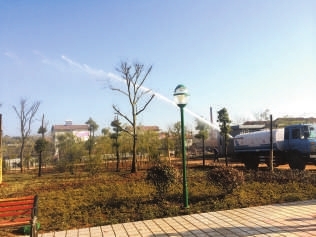 4月29日,记者在栗林村的青龙路一期还建点看到:绿地成片,绿树成荫,鹅卵石铺就的小道通达广场中心。广场旁的双车道水泥路上,几名道路养护工正在给道路的缝隙浇注沥青;而广场旁边,几名村民正补种红叶石楠的幼苗。