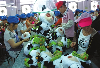 昨日,广西灵山县妇女在生产外销欧美的儿童玩具。
