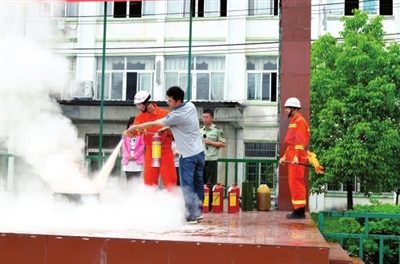 5月12日,崇阳县职校学生在消防官兵的指导下使用灭火器灭火。