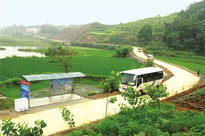 行走在平整洁净的通村公路,两旁新栽的樟树发出的嫩叶闪闪发亮,一栋栋农家小别墅依山傍水而建,印有“农村客运“的客车徐徐驶入村庄,村民在候车亭旁喜悦地登上客车……