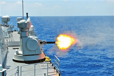 5月21日,中俄“海上联合-2015(I)”军事演习进入对海上和空中目标进行火炮射击、实射深水炸弹阶段,中国海军导弹护卫舰临沂舰副炮实弹射击。