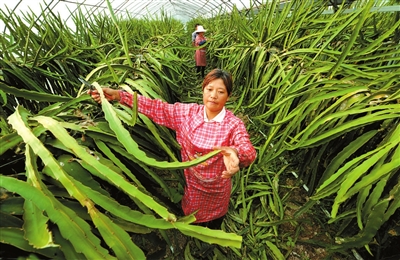 5月21日,赤壁市车埠镇大林农业开发公司的员工为即将开花的火龙果修枝。