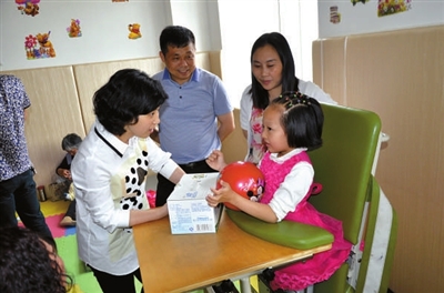 县残疾人康复中心依托县中医院实施康复工程,为0-6岁的残疾儿童提供康复训练治疗。在县残疾人康复中心PT康复室,因车祸受伤的何明媚小朋友,正在接受下肢康复治疗。宋昵荔走到她面前,进行了有针对性的互动。在康复室内,一名残疾儿童在接受治疗时大声哭泣,宋昵荔蹲下来,给孩子擦去泪水,并轻轻抚摸孩子的脸,安抚孩子的情绪。在语言康复室,四岁的陈贝康在家长和医生的陪同下,正在进行语言和手指的训练,看到陈贝康把积木搭起来了,宋昵荔拍手称赞“你真棒”,得到鼓励的陈贝康高兴地唱起歌来。宋昵荔还一一向家长们耐心询问了孩子们的康复情况,并鼓励家长要树立信心,耐心对待孩子。宋昵荔还与医护人员亲切交谈,希望医护人员尽最大所能,让残疾儿童们与正常的孩子一样健康、快乐、幸福地成长、生活。