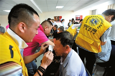 24日,广东狮子会志愿者为接受免费白内障手术救助的患者摘去纱布。