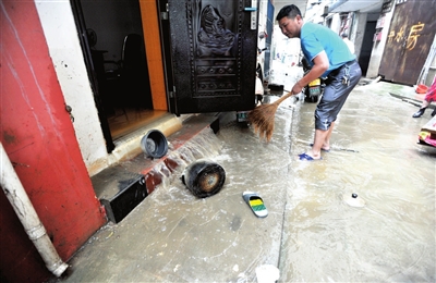 “我是最早起床的,大概5点多的时候,水已经淹到这个楼梯口了,我是淌着齐腰深的水出去的。”舒先生是一名送报员,他的摩托车停在楼梯间,已经被水泡坏。无奈之下,舒先生只得找朋友借了一辆车才把报纸送完。
